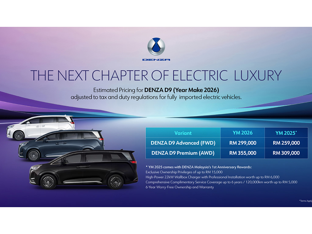 With the transition to the 2026 model year approaching, DENZA Malaysia confirmed that the upcoming 2026 DENZA D9 range will reflect an approximate 15% adjustment, driven by removal of tax and duty exemptions for fully imported electric vehicles The recommended pricing for the 2026 model year is expected to start from RM299,000 for the D9 Advanced (FWD) variant and RM355,000 for the D9 Premium (AWD) variant.