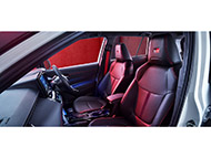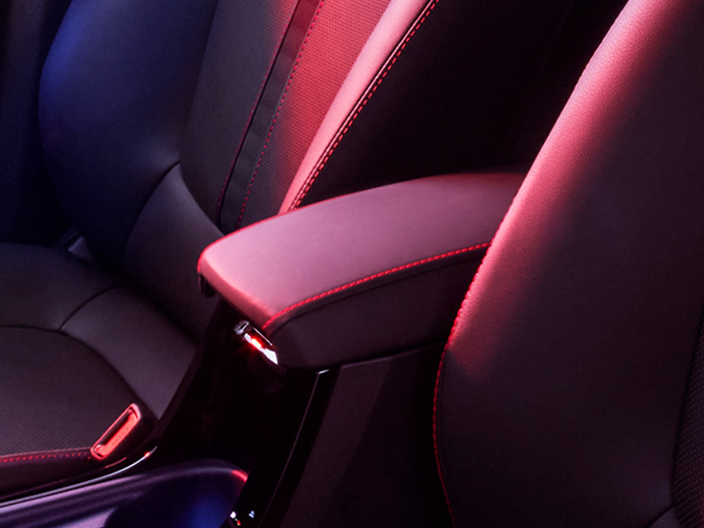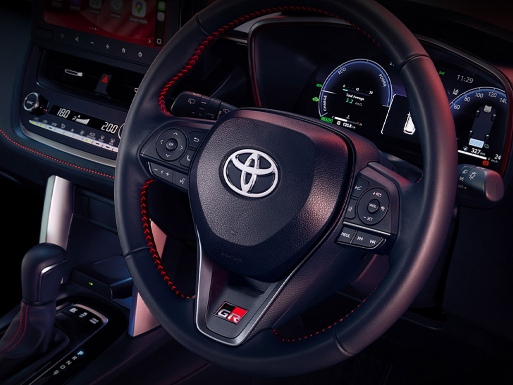Inside, the Corolla Cross HEV GR Sport delivers a driver-focused cabin that blends sport-inspired detailing with everyday comfort. A monotone black interior is accented with bold red highlights and GR red stitching across the door trims, steering wheel, instrument panel, and shift lever boot. Exclusive red seatbelts, dark silver trim elements, and seats featuring premium GR-embroidered headrests elevate the sense of craftsmanship. GR branding on the steering wheel and key fob adds a distinctive premium touch, reinforcing the cabin’s performance-inspired character.