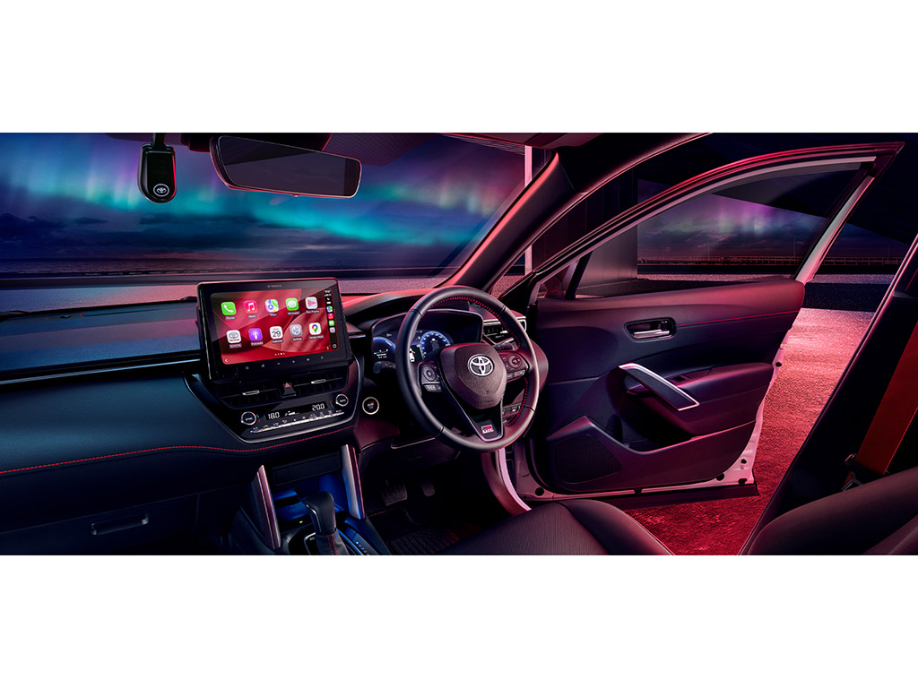 Inside, the Corolla Cross HEV GR Sport delivers a driver-focused cabin that blends sport-inspired detailing with everyday comfort. A monotone black interior is accented with bold red highlights and GR red stitching across the door trims, steering wheel, instrument panel, and shift lever boot. Exclusive red seatbelts, dark silver trim elements, and seats featuring premium GR-embroidered headrests elevate the sense of craftsmanship. GR branding on the steering wheel and key fob adds a distinctive premium touch, reinforcing the cabin’s performance-inspired character.